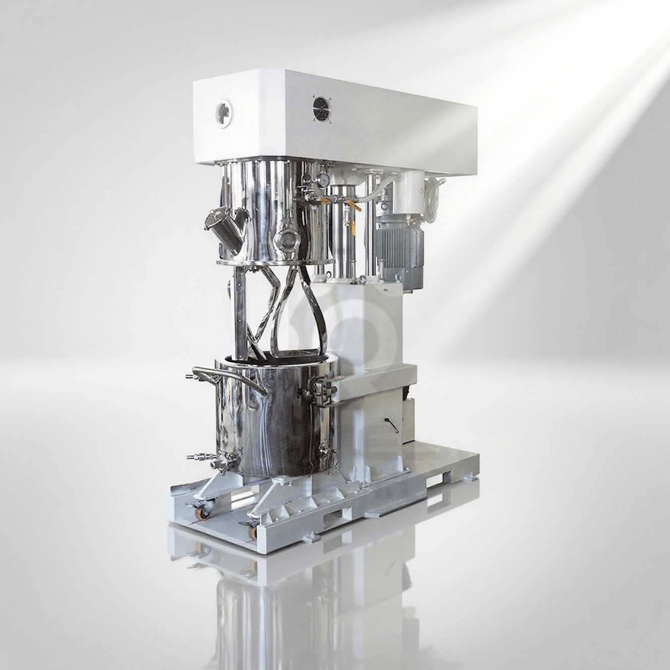 雙行星動(dòng)力攪拌機(jī)雙行星動(dòng)力混合機(jī)是一種新型且對(duì)多種混合液體、粉體進(jìn)行攪拌、溶解、分散、均質(zhì)效率好的攪拌設(shè)備。該設(shè)備配有高速、低速、活動(dòng)刮板部件,低速攪拌部件采用行星齒輪傳動(dòng),攪 -